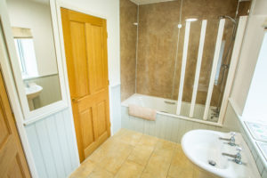 - Large bathroom with underfloor heating – bath, basin, and WC.